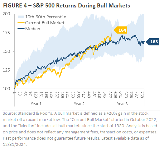 Figure 4 tracks the current bull market, which started in October 2022 and is now in its third year. The current bull market has performed in line with historical norms, but the chart shows that returns often moderate as bull markets mature. This suggests that the market’s focus could shift to fundamentals and earnings as the next catalyst to push markets higher. 2025 is shaping up to be a year where companies will need to deliver on investors’ expectations to justify their high valuations.