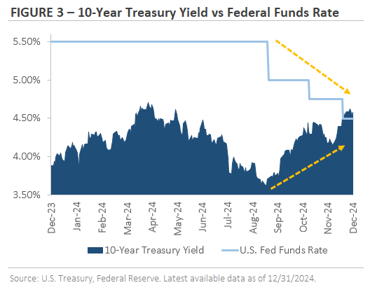 Figure 3 graphs the 10-year Treasury yield against the federal funds rate, which is the interest rate the Fed adjusts to set monetary policy. Since the first rate cut in September, the federal funds rate has decreased by -1.00%. While the Fed controls shorter-maturity interest rates, the market has more control over longer-maturity interest rates. Over the same period, the 10-year Treasury yield has had the opposite reaction: rising by nearly +1.00%.