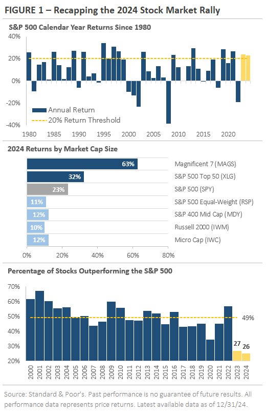 The past two years have been remarkable for investors, with the S&P 500 delivering strong returns in back-to-back years. The three charts in Figure 1 take a closer look at the stock market’s rally in 2024, a year in which the S&P 500 set more than 55 new all-time highs.