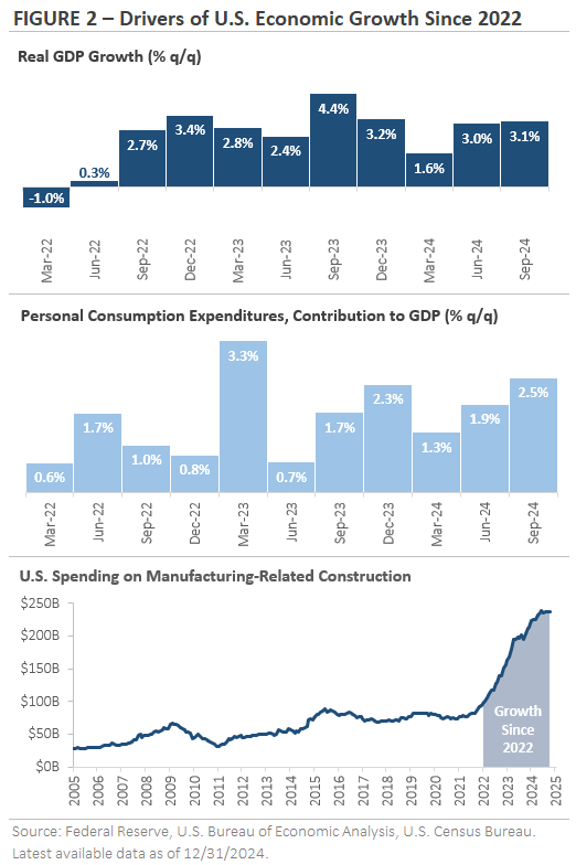 While higher rates have slowed housing demand and weighed on business investment, the U.S. economy has managed to defy expectations with solid GDP growth. The top chart in Figure 2 shows the U.S. economy grew at a +3.1% annualized pace in 3Q24, marking the third quarter in the past four with growth above +3%.