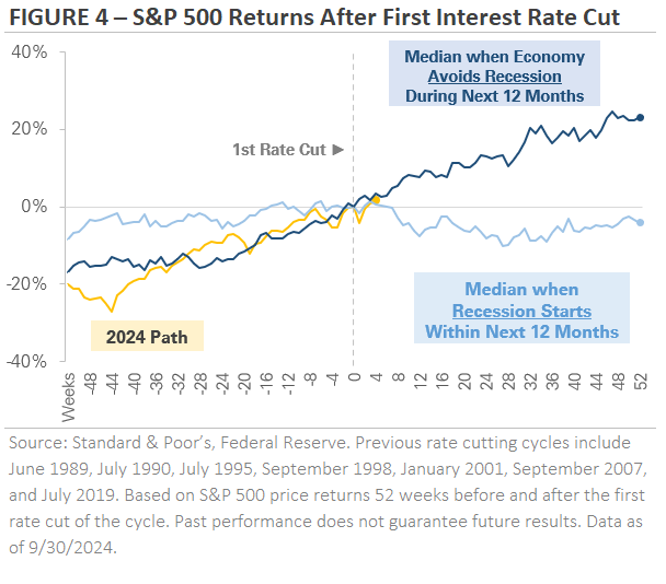 The next chart demonstrates why the economy’s direction is important. Figure 4 tracks the S&P 500’s performance in the 12 months before and after the first interest rate cut. It features two paths. The dark blue line represents the S&P 500’s median return path when the economy avoids a recession in the 12 months following the first rate cut.
