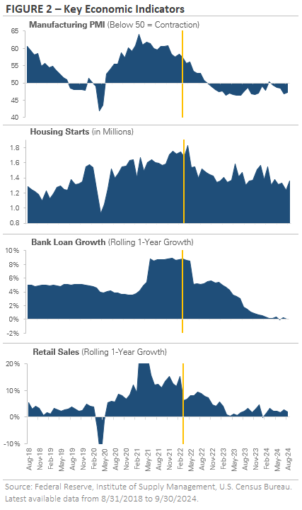 Figure 2 graphs four economic indicators that offer insight into the current state of the U.S. economy: manufacturing PMI, housing starts, consumer credit, and retail sales. To show the impact of interest rate hikes, the start of the Fed’s tightening cycle in March 2022 is marked on each chart.