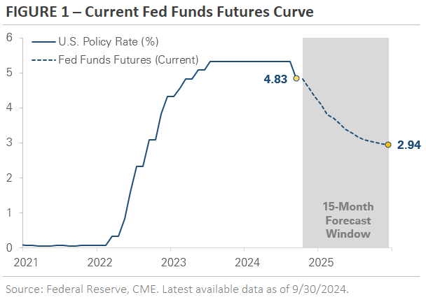 Figure 1 uses Fed funds futures to show the market’s rate-cut expectations. The market expects an additional -0.50% of rate cuts by the end of this year, followed by another -1.50% by the end of 2025.