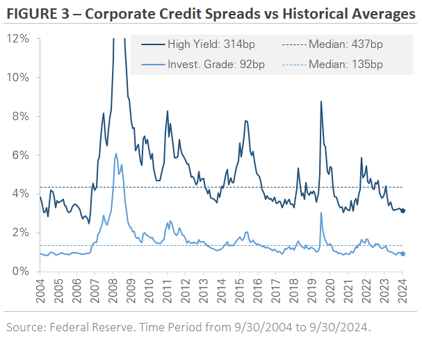 Credit spreads, which measure the difference in yield between two bonds of similar maturity but different credit quality, remain tight by historical standards.